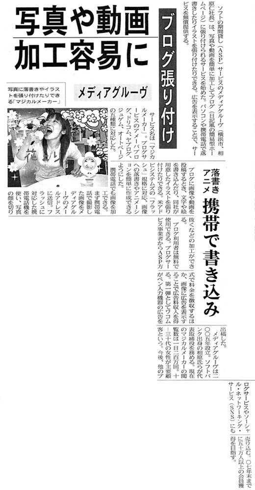 1月11日の日経産業新聞2面に当社メディアグルーヴと当社のサービス「マジカルメーカー」「マジカルムービー」「マジカルメール」についての紹介記事が掲載されました。