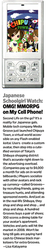 "モバイル仮想世界サービス『ちぷやタウン(CHIPUYA TOWN)』"の紹介記事が世界を代表するアメリカの情報誌「WIRED」2007年12月号64ページに掲載されました。 WIRED誌(アメリカ/英文) http://www.wired.com/culture/lifestyle/magazine/15-12/st_jsgw